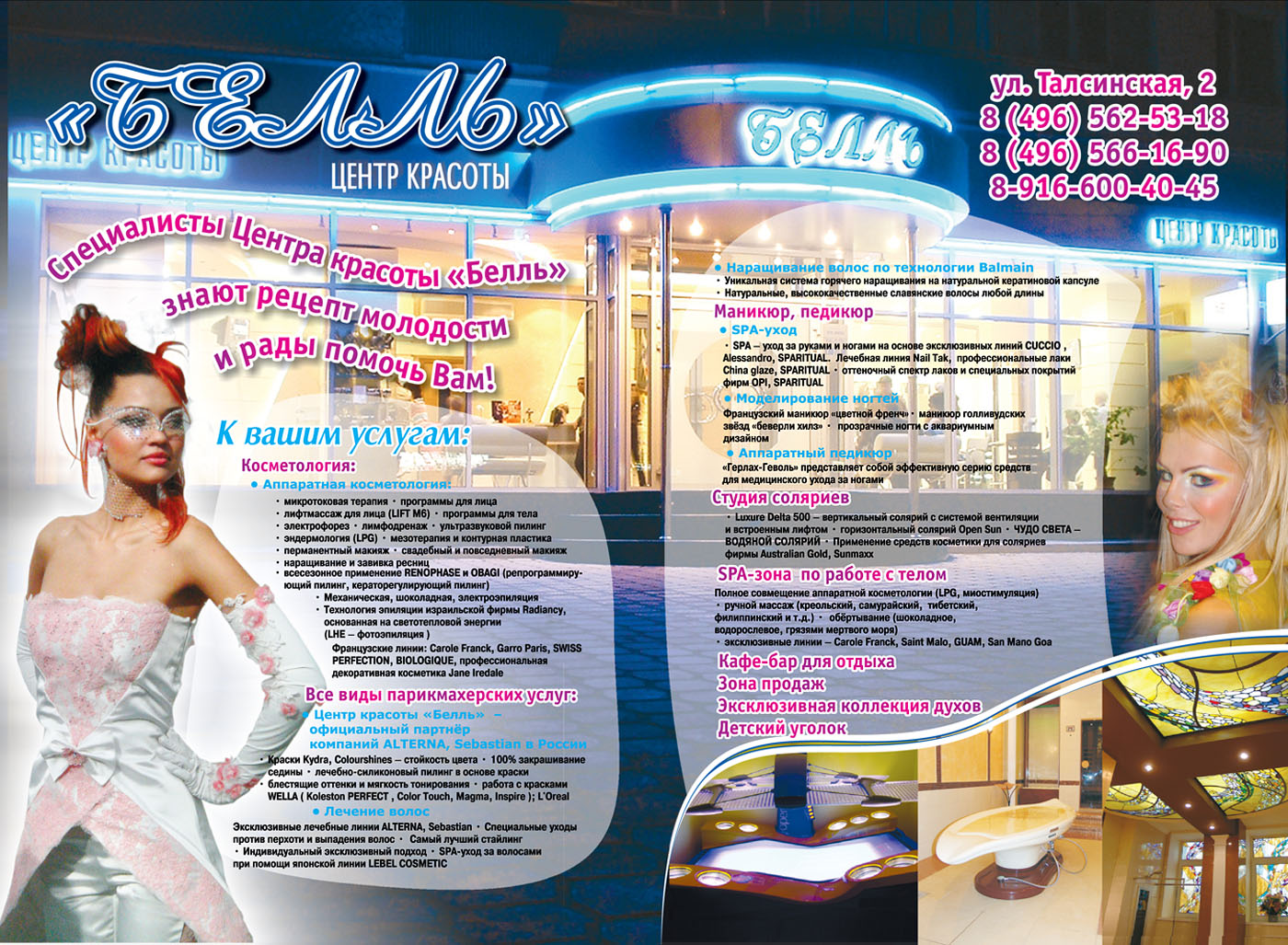 В Центре красоты «Белль» проводится SPA-уход за руками и ногами на основе эксклюзивной линии CUCCIO (США). Лечебная линия Nail Tak, профессиональные лаки China glaze решают все проблемы с отслоением ногтевой пластины и способствуют выравниванию ногтевого ложа. Довершает индивидуальность имиджа расширенный оттеночный спектр лаков и специальных покрытий фирм OPI, SPARITUAL.