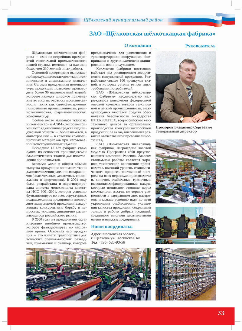 ЗАО «Щёлковская шёлкоткацкая фабрика» награждено золотой медалью Программы «500 преуспевающих компаний России». Залогом стабильной работы является хорошее техническое оснащение производства, высокий уровень технологического процесса, постоянный контроль на всех переходах производства и, конечно, стабильные, грамотные, высококвалифицированные кадры, которые понимают стоящие перед коллективом задачи, не теряют уверенности в завтрашнем дне, настроены и дальше успешно идти по пути укрепления стабильности, улучшения качества продукции, сохранения темпов в работе, добрых традиций, созданного многими десятилетиями имени и имиджа предприятия.
