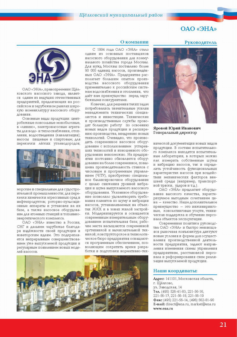 ОАО «ЭНА», правопреемник Щёлковского насосного завода, является одним из ведущих отечественных предприятий, предлагающих на российском и зарубежном рынках широкую номенклатуру насосного оборудования.