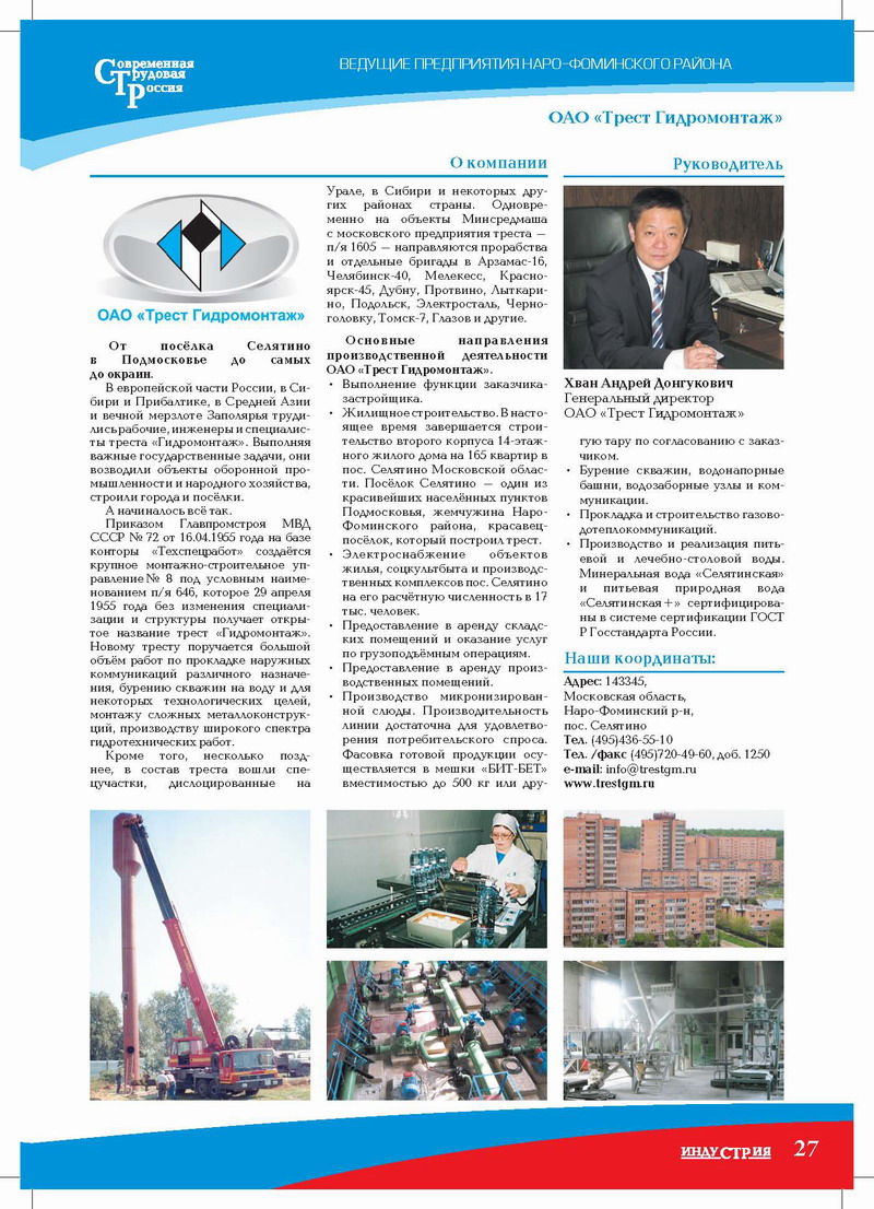 Основные направления производственной деятельности ОАО «Трест Гидромонтаж»: выполнение функции заказчика-застройщика; жилищное строительство. В настоящее время завершается строительство второго корпуса 14-этажного жилого дома на 165 квартир в пос. Селятино Московской области. Посёлок Селятино – один из красивейших населённых пунктов Подмосковья, жемчужина НароФоминского района, красавец-посёлок, который построил трест.