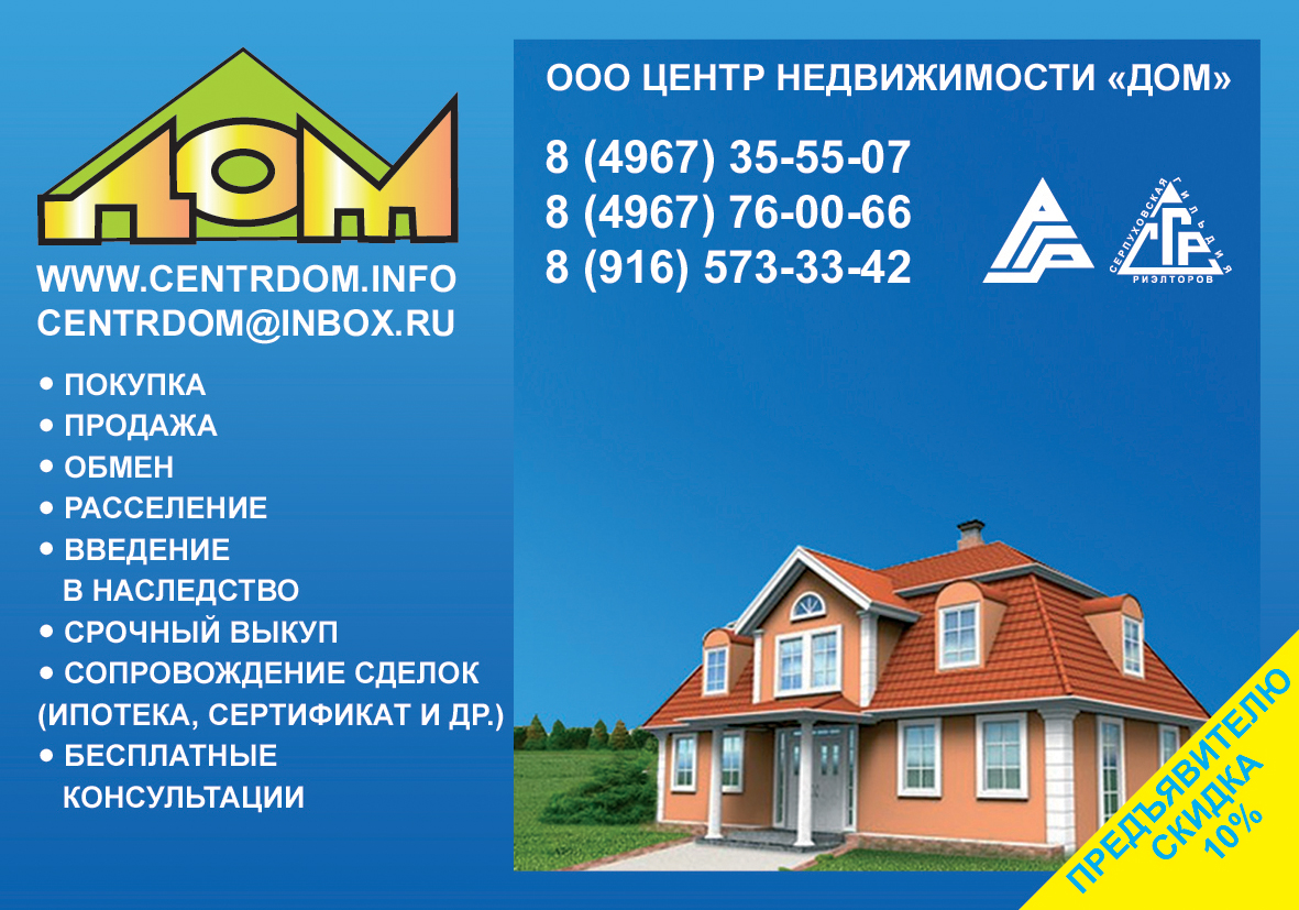Недвижимость в Серпухове и районе. Покупка, продажа, обмен, ипотека, квартиры, комнаты, дома, дачи, земельные участки, самые актуальные предложения на рынке недвижимости, база данных, удобный поиск на нашем сайте.
