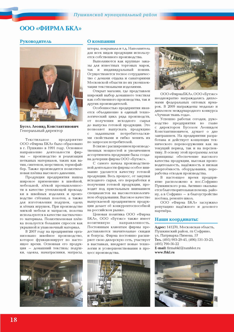 Текстильное предприятие ООО «Фирма БКЛ» было образовано в г. Пушкино в 1991 году. Основное направление деятельности фирмы – производство и реализация нетканых материалов, таких как ватин, синтепон, шерстипон, термофайбер. Также производится полиэтиленовая плёнка высокого давления.