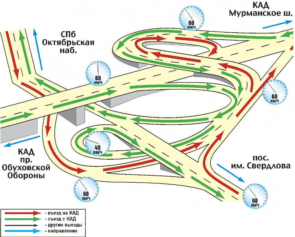 Данная развязка состоит из двух уровней, создана она по довольно сложному профилю. На этом участке водителям рекомендуется обратить особенное внимание в тот момент, когда происходит въезд на кольцевую дорогу с Обуховского проспекта. В этой ситуации требуется свернуть на право, где располагается