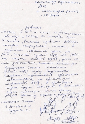 11 апреля 2013 г.Ответьте, пожалуйста, почему без предупреждения и предварительного вывешивания объявления на остановке, 18.05.2012. не был предоставлен рейс по маршруту 11 в 7,20 утра. В результате мы опоздали на электричку и на работу. Копия письма будет отпралена в администрацию!
