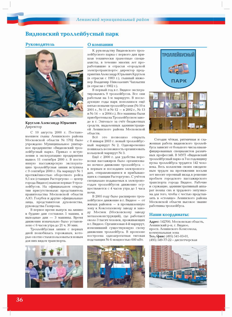 К руководству Видновского троллейбусного парка с первого дня пришли технически грамотные специалисты, в течение многих лет проработавшие в отрасли «городской электротранспорт»: директор предприятия Александр Юрьевич Круглов (в отрасли с 1983 г.), главный инженер Владимир Николаевич Чаплыгин (в отрасли с 1982 г.).