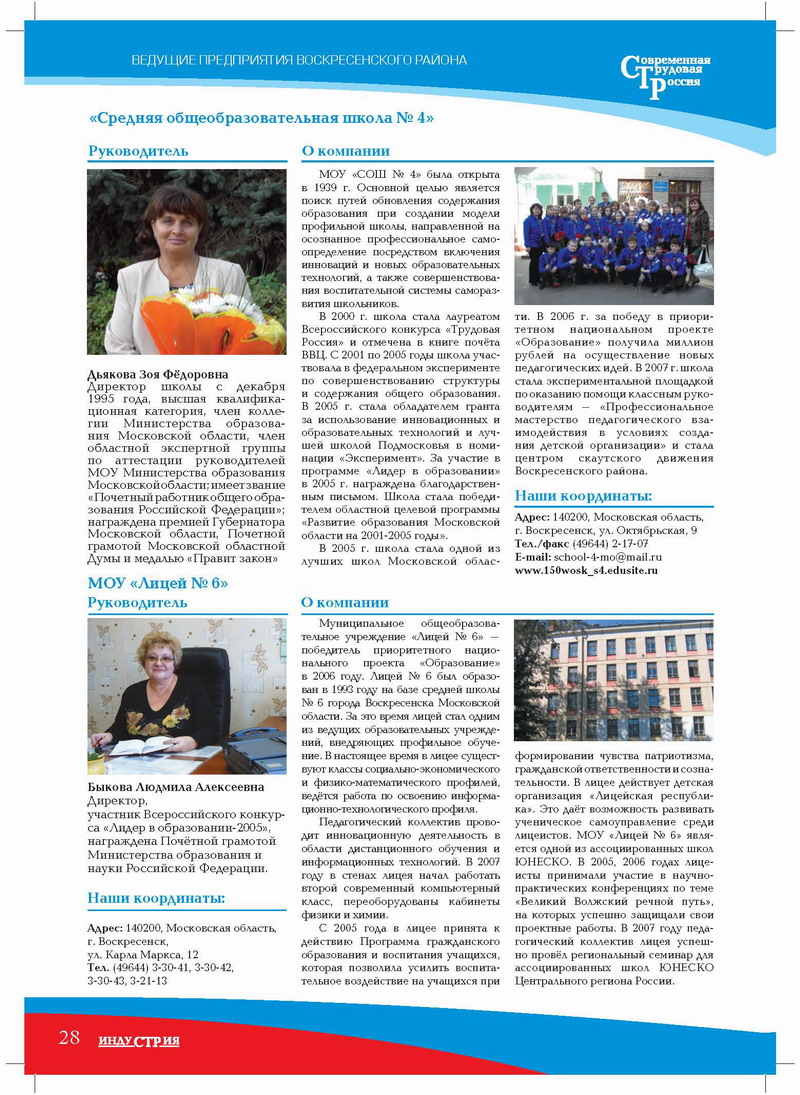 Муниципальное общеобразовательное учреждение «Лицей № 6» – победитель приоритетного национального проекта «Образование» в 2006 году. Лицей № 6 был образован в 1993 году на базе средней школы № 6 города Воскресенска Московской области. За это время лицей стал одним из ведущих образовательных учреждений, внедряющих профильное обучение. В настоящее время в лицее существуют классы социальноэкономического и физикоматематического профилей, ведётся работа по освоению информационно-технологического профиля.