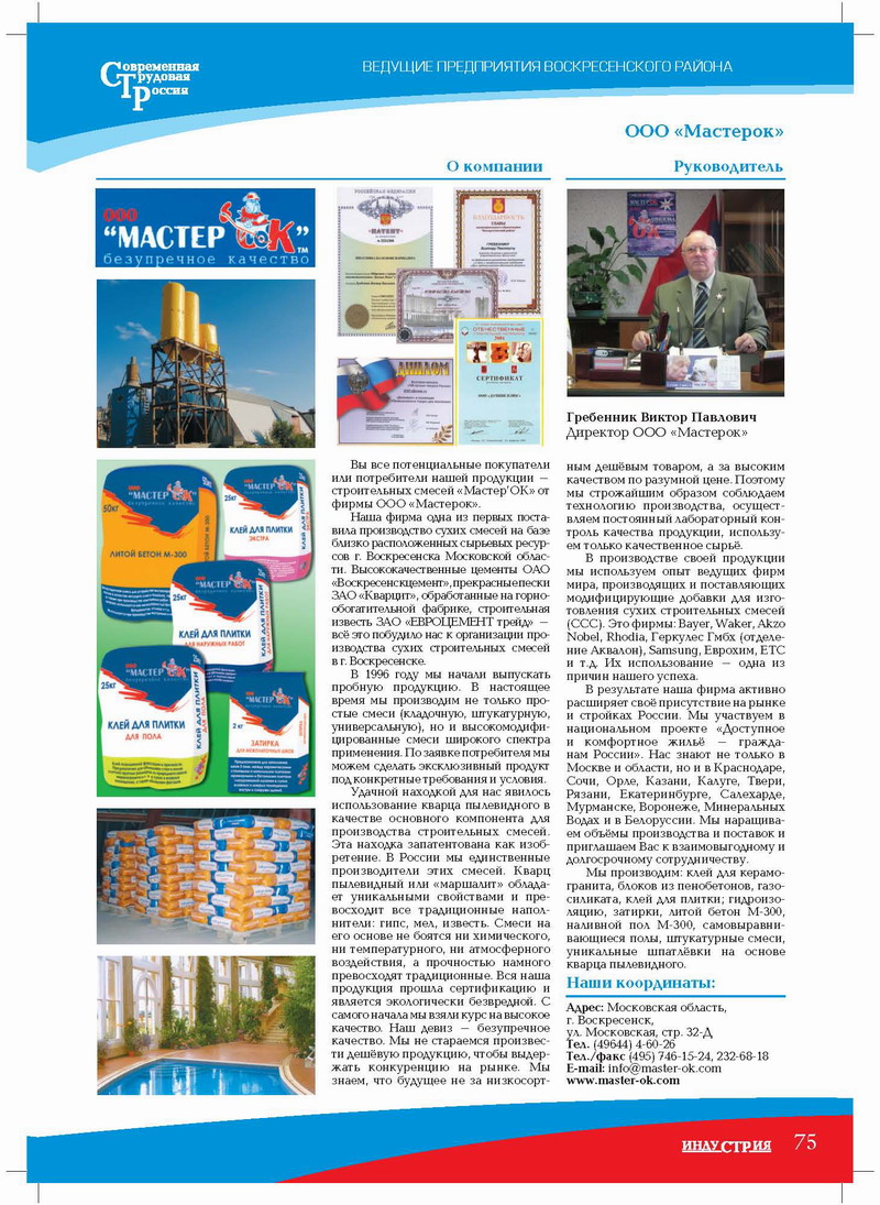 Наша фирма одна из первых поставила производство сухих смесей на базе близко расположенных сырьевых ресурсов г. Воскресенска Московской области. Высококачественные цементы ОАО «Воскресенскцемент», прекрасные пески ЗАО «Кварцит», обработанные на горнообогатительной фабрике, строительная известь ЗАО «ЕВРОЦЕМЕНТ трейд» – всё это побудило нас к организации производства сухих строительных смесей в г. Воскресенске.