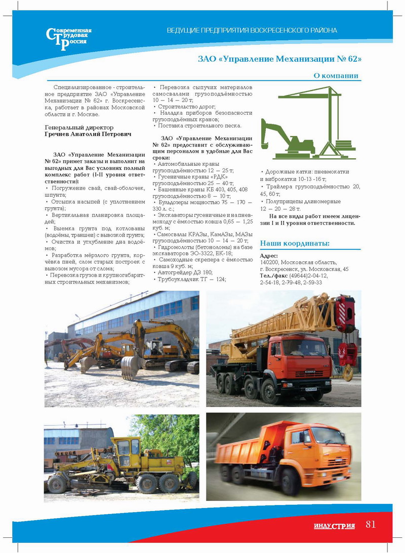ЗАО «Управление Механизации № 62» предоставит с обслуживающим персоналом в удобные для Вас сроки: автомобильные краны грузоподъёмностью 12 – 25 т; гусеничные краны «РДК» грузоподъёмностью 25 – 40 т; башенные краны КБ 403, 405, 408 грузоподъёмностью 8 – 10 т; бульдозеры мощностью 75 – 170 – 330 л. с.; экскаваторы гусеничные и на пневмоходу с ёмкостью ковша 0,65 – 1,25 куб. м; самосвалы КРАЗы, КамАЗы, МАЗы грузоподъёмностью 10 – 14 – 20 т; гидромолоты (бетоноломы) на базе экскаваторов ЭО3322, ЕК18; самоходные скрепера с ёмкостью ковша 9 куб. м; автогрейдер ДЗ 180; трубоукладчик ТГ – 124; дорожные катки: пневмокатки и виброкатки 1013 16 т; трайлера грузоподъёмностью 20, 45, 60 т; полуприцепы длиномерные 12 – 20 – 28 т.