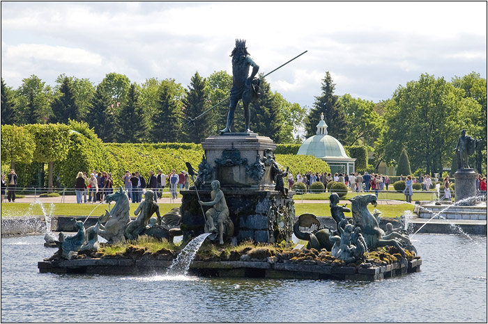 Фонтан Нептун занимает центральное место в Верхнем саду. Нептун расположен между Межеумным и Дубовым фонтанами.