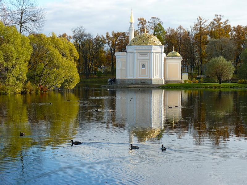 Турецкая баня расположена в Екатерининском парке у самой кромки воды Большого пруда Государственного музея-заповедника под Санкт-Петербургом. Первый проект бани, представленный зодчим К. М. Росси в 1848 году, не был одобрен императором Николаем I. Поэтому разработкой нового плана занялся архитектор